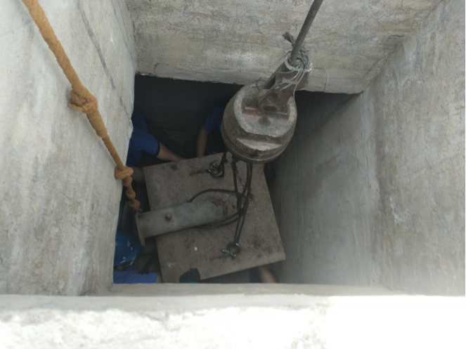 三、安全員對(duì)提下泵前各項(xiàng)工作進(jìn)行檢查,是否正確佩戴安全防護(hù)用品、是否斷電、對(duì)井室進(jìn)行先通風(fēng)、后對(duì)有害氣體進(jìn)行檢測(cè),檢查井室內(nèi)有無對(duì)工作有影響的雜物等,簽下井作業(yè)票,確保安全后,作業(yè)人員下井工作。