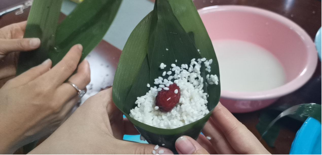 活動現場大家圍在桌子周圍洗粽葉、裹粽子,講述端午節(jié)的故事,言笑嘻怡、其樂融融,洋溢著節(jié)日的氛圍。