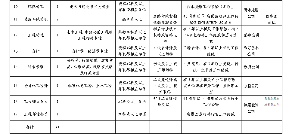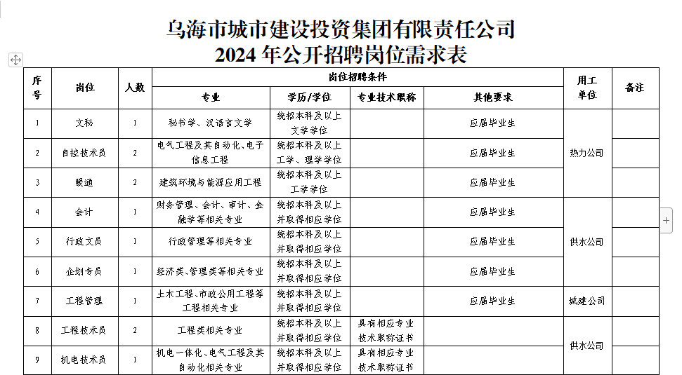 本次計劃招聘21人,其中應(yīng)屆畢業(yè)生9人。具體崗位及學(xué)歷、專業(yè)、資格條件詳見《烏海市城市建設(shè)投資集團(tuán)有限責(zé)任公司2024年公開招聘崗位需求表》(以下簡稱《崗位需求表》(附件)。