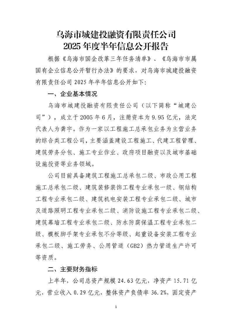 - 2025-04-10烏海市城建投融資有限責(zé)任公司2024年度信息公開(kāi)報(bào)告